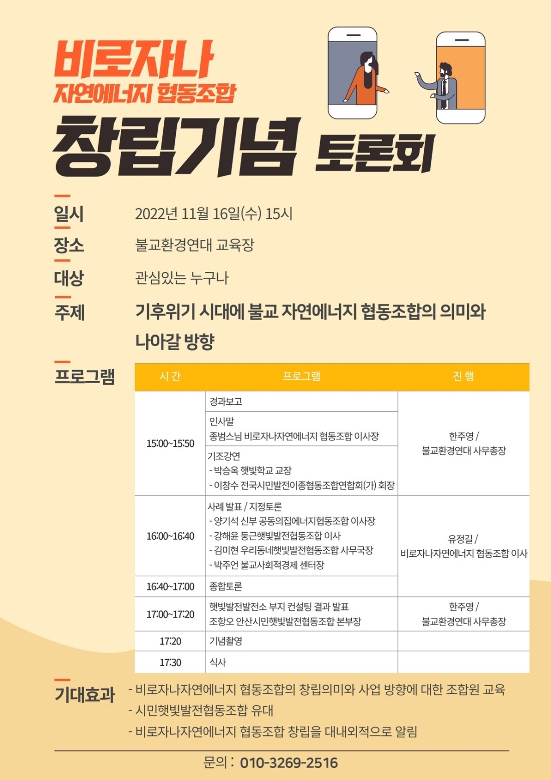 3시, 불교환경연대 교육장(그린담마홀)에서 ‘기후위기 시대에 불교 자연에너지 협동조합의 의미와 나아갈 방향’을 주제로 창립기념 토론회를 개최한다.